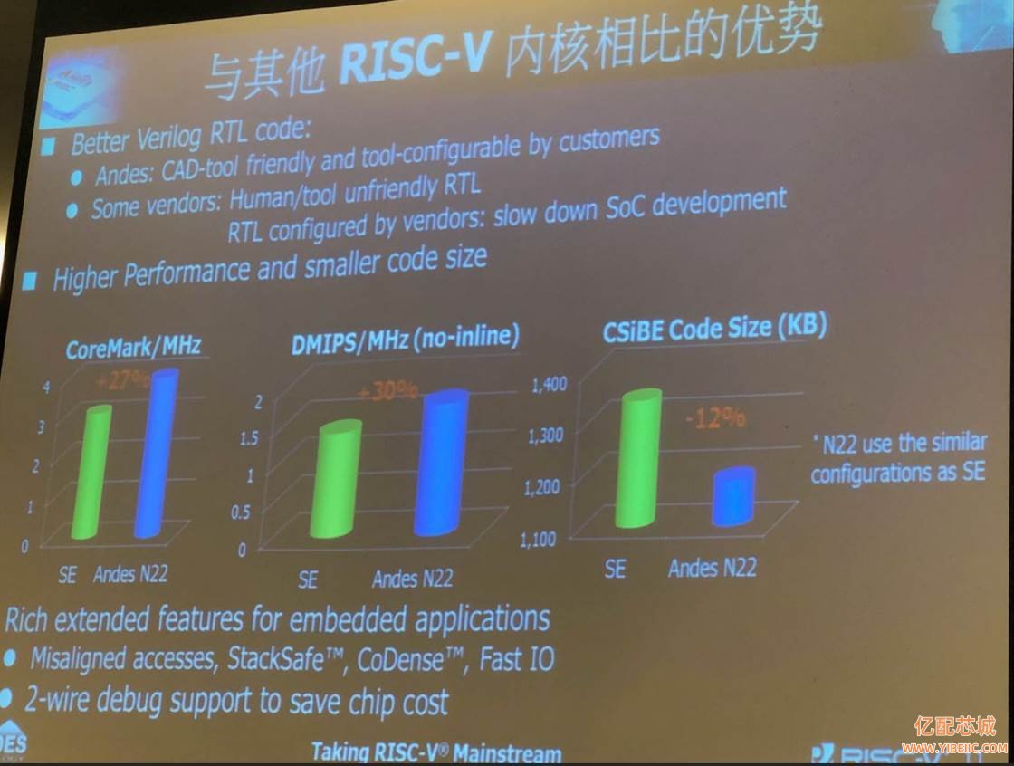 胡振波表示,芯来科技和晶心科技合作开发的AndesCore™ N22处理器内核IP完全满足上述五要素。具2阶流水线的N22是晶心V5系列产品中最小的RISC-V内核,但却提供了令人印象深刻的3.93 CoreMark/MHz性能。如果采用台积电28纳米工艺,在最差的情况下,其性能也能达到750MHz以上。